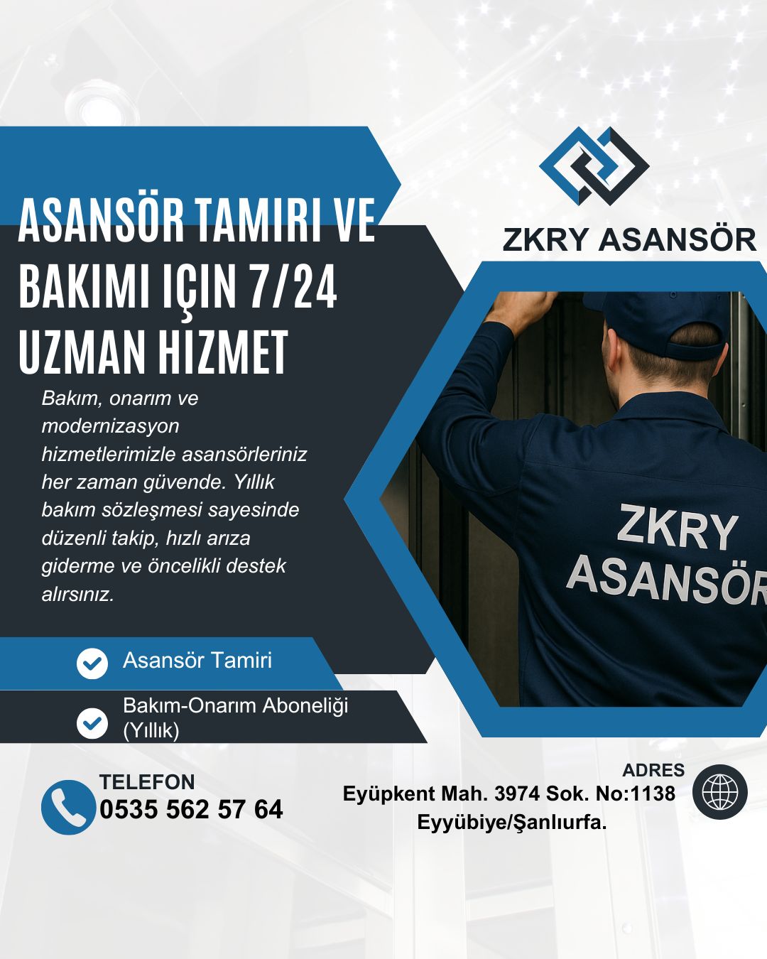 Günümüzde birçok firma Şanlıurfa genelinde 7/24 tamir hizmeti sunarak acil durumlarda hızlı müdahale imkânı sağlar. Tamir sonrası yapılan testlerle asansör güvenli şekilde tekrar hizmete alınır.